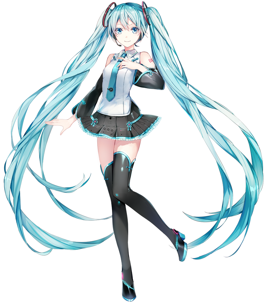 + the most popular and well known vocaloid+ has preformed live at events like COACHELLA+ long cyan pigtails, cyan eyes and sometimes shown with headset+ special item: leek